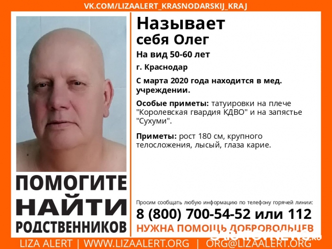 С марта 2020 года в одном из медицинских учреждений Краснодара находится неизвестный мужчина, который называет себя Олег. Больше он ничего не помнит. Волонтеры просят помочь в поиске родственников потерявшего память человека.
