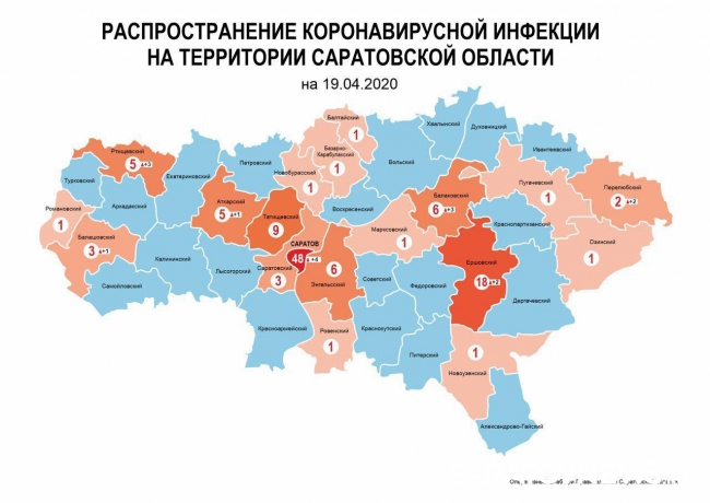 На 19 апреля в регионе обнаружены 114 случаев заболевания в 19 муниципальных образованиях области, включая город Саратов. Напомним, еще в пятницу их было 15. За прошедшие полтора дня на карте тревожно покраснели Романовский, Марксовский и Ровенский районы, где выявлено по одному новому случаю, а также Перелюбский, где появились сразу двое зараженных.