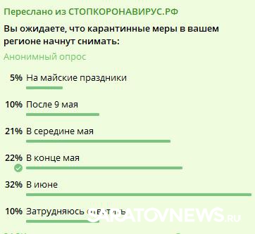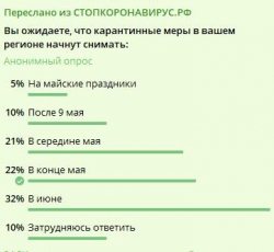 Согласно результатам проведенного Telegram-каналом «СТОПКОРОНАВИРУС.РФ» опроса, россияне ожидают, что карантинные меры в регионах начнут снимать в июне.