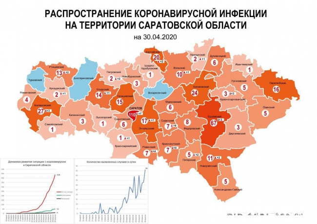 Новые случаи подтвердили сразу в трех районах за сутки, теперь их 36 из 39. Только на трех территориях в настоящее время инфекция не зарегистрирована, это Турковский, Екатериновский и Воскресенский районы.