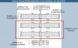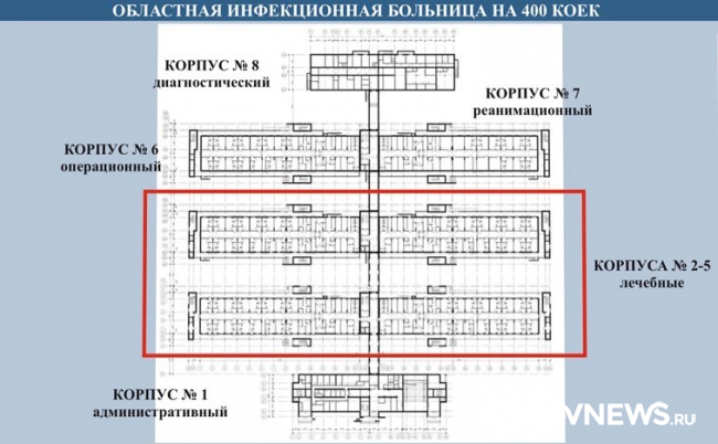 Сообщается, что больница будет состоять из восьми корпусов: административный, реанимационный, операционный, диагностический и четыре лечебных. Также в учреждении, в числе прочего, будет прачечная, гараж для автомобилей скорой помощи с дезинфекционным боксом, котельная, дизельный генератор. Предполагаемая конструкция несущего остова - кирпич и монолитный железобетон.