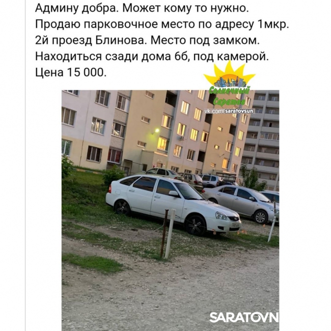 Сегодня, 12 мая, в одном из городских пабликов Саратова появилось странное сообщение о продаже парковочного места в Солнечном районе. Горожане высмеяли эту затею и назвали продавца мошенником.