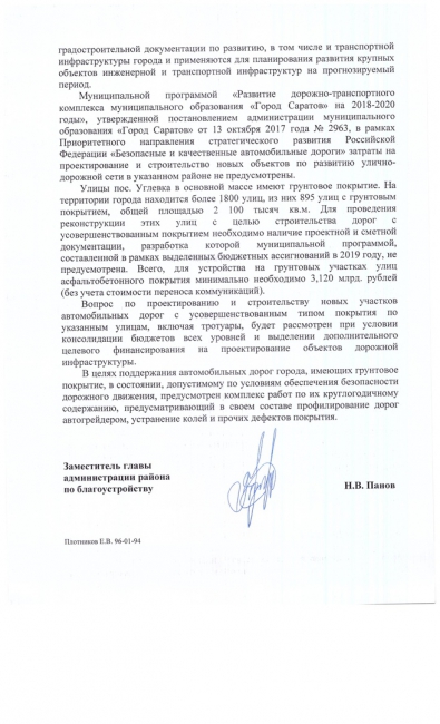 В приложенном ответе на запрос сказано, что посторонних предметов на проезжей части не имеется, проезд транспорта обеспечен. К такому выводу пришли сотрудники комитета дорожного хозяйства, благоустройства и транспорта при администрации Саратова. Также в документе отмечено, что затраты на строительство новой дороги в указанном районе в бюджете не предусмотрены.