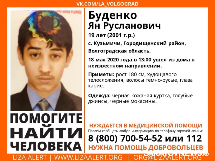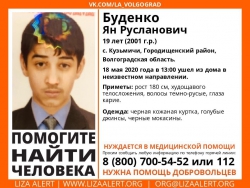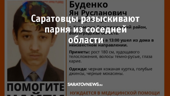 Как сообщают поисковики, та территории Саратовской области может находиться 19-летний Ян Буденко. Молодой человек проживает в селе Кузьмичи, Городищенского района, Волгоградской области. 18 мая в 13:00 ушел из дома в неизвестном направлении и с тех пор его никто не видел. По имеющейся информации, парень может нуждаться в медицинской помощи.