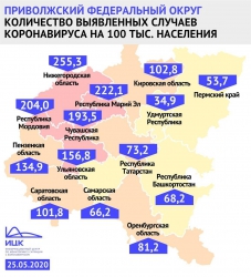 По данным на 25 мая о количестве выявленных случаев инфекции на 100 тысяч населения, Саратовская область находится на восьмом месте в Приволжском федеральном округе с показателем 101,8.