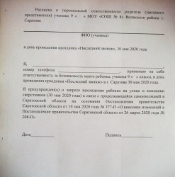 Как следует из документа, ответственность за безопасность и соблюдение подростками самоизоляции в день праздника ложится на их родителей или опекунов. Таким образом, руководство школы с себя эту ответственность снимает.