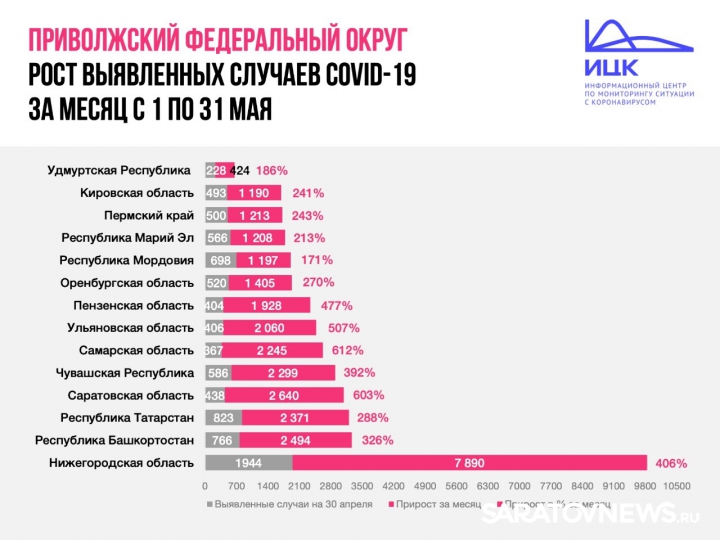На сегодняшний день, 1 июня, рост числа заболевших COVID-19 в Саратовской области составил 603 процента за месяц. Такие данные публикует информационный центр по мониторингу ситуации с коронавирусом (ИЦК).