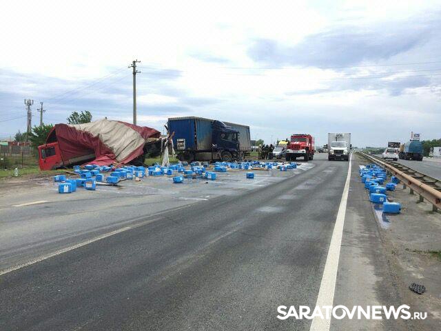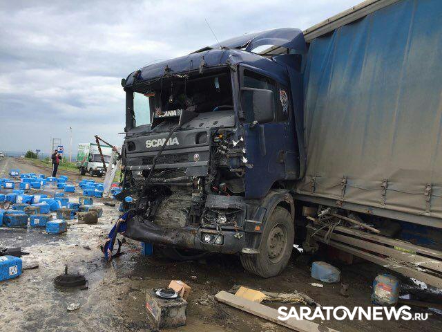 По предварительным данным авария произошла в 13:00 на 276 километре автодороги «Саратов―Волгоград». Фура Саратовский район фура MAN, под управлением 32-летнего водителя, врезалась в фуру Scania, за рулем которой находился 47-летний гражданин. В результате из кузова первого автомобиля посыпались канистры.