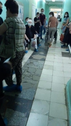 Посетители, в том числе обратившиеся с температурой, пришли сдать кровь и пройти рентген. При этом, как видно на фото, ограничительные меры не соблюдаются. Горожане столпились, не имея возможности соблюдать социальную дистанцию. Как утверждает автор, в общей очереди горожане сидели по два часа, а позже у одной из женщин, находившейся там, была выявлена пневмония. При этом ей так и не предоставили тест на COVID-19.