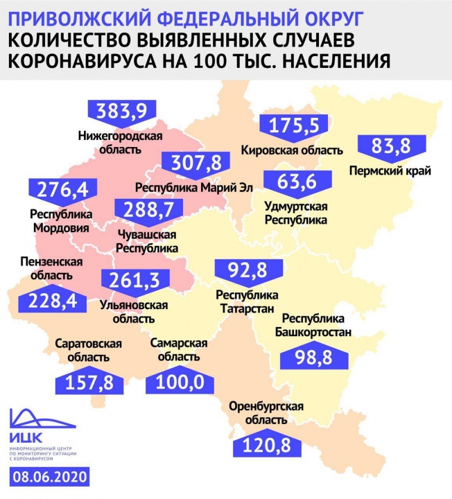 На первом месте по-прежнему Нижегородская область. Ее показатель равен 383,9. На втором оказалась Республика Марий Эл: 307,8. На третьем Чувашия с показателем 288,7. Данные предоставлены федеральным информационным центром по мониторингу ситуации с коронавирусом.