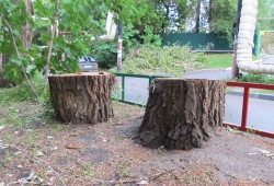На днях на улице Тульской были срублены два огромных дерева, которые ничуть не мешали жителям (наоборот, создавали тень), ветки деревьев не дотрагивались до линии электропередач. За «компанию» было кронировано молодое дерево (возраст виден по толщине ствола), которое теперь напоминает столб.