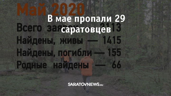 За май в отделение поискового отряда «Лиза Алерт» по Саратовской области поступило 29 заявок по поводу пропавших людей. К счастью, большинство горожан благополучно вернулись домой: живыми найдены 25 человек. Погибших оказалось двое. Еще двум гражданам, потерявшим память, помогли найти родственников.