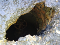 Посмотрев в дыру, можно увидеть находящиеся под ней на глубине одного-двух метров трубы и вентиль. Постепенно провал расширяется.