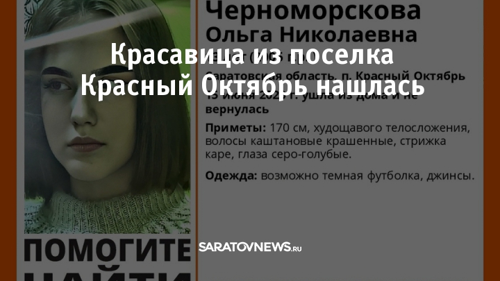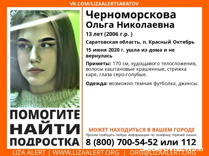 Сегодня, пропавшая в понедельник 13-летняя Ольга Черноморскова вернулась домой. Девушка жива и невредима. Напомним, юная жительница поселка Красный Октябрь 15 июня 2020 года ушла из дома и пропала. В ее поисках участвовало саратовское отделение «Лиза Алерт».