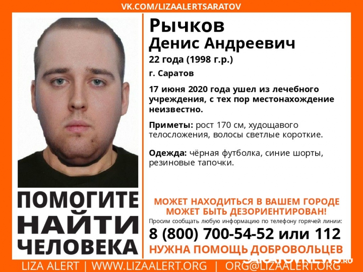 Пропал 22-летний Денис Рычков, проживающий в Саратове. 17 июня 2020 года он ушел из дома и не вернулся. СЧ тех пор его никто не видел.