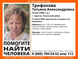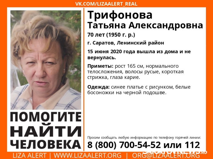 Если вам известно что-либо о местонахождении Татьяны Трифоновой, сообщите по номеру 8 (800) 700-54-52 или 112. Инфорг поисков Людмила Соловушка: +79372240660.