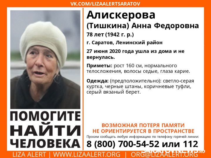 78-летняя Алискерова Анна Федоровна вчера вечером, 27 июня, ушла из дома и так и не вернулась. Волонтеры сообщают приметы бабушки: рост 160 сантиметров, нормального телосложения, седые волосы, карие глаза. Предположительно, пропавшая была одета в светло-серую куртку, черные штаны, коричневые туфли и серый вязаный берет. «Лиза Алерт» уточняют, что женщина дезориентирована, также у неё возможна потеря памяти.