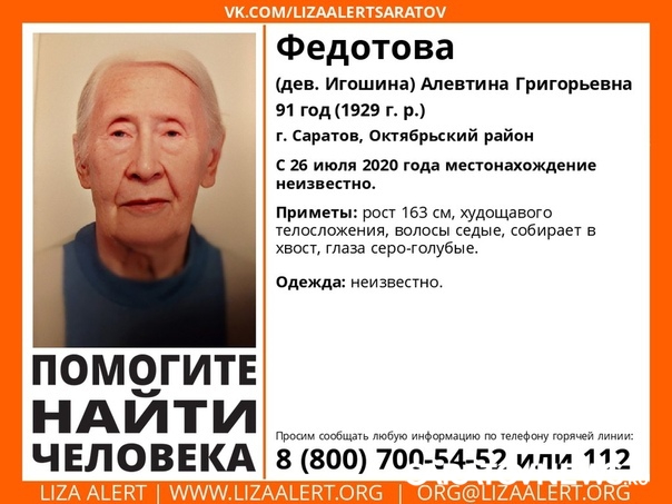 91-летняя Федотова (Игошина) Алевтина Григорьевна пропала 26 июля. Поисковики сообщают приметы бабушки: рост 163 сантиметра, худощавого телосложения седые собранные в хвост волосы, серо-голубые глаза.