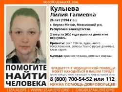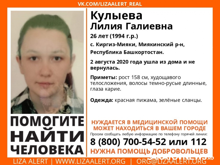 По имеющейся информации, на территории Саратовской области может находиться 26-летняя Лилия Кулыева, проживающая в селе Киргиз-Мияки, Миякинский района республики Башкортостан. 2 августа 2020 года она ушла из дома и не вернулась. Пропавшая может нуждаться в медицинской помощи.