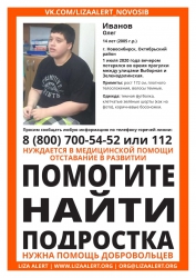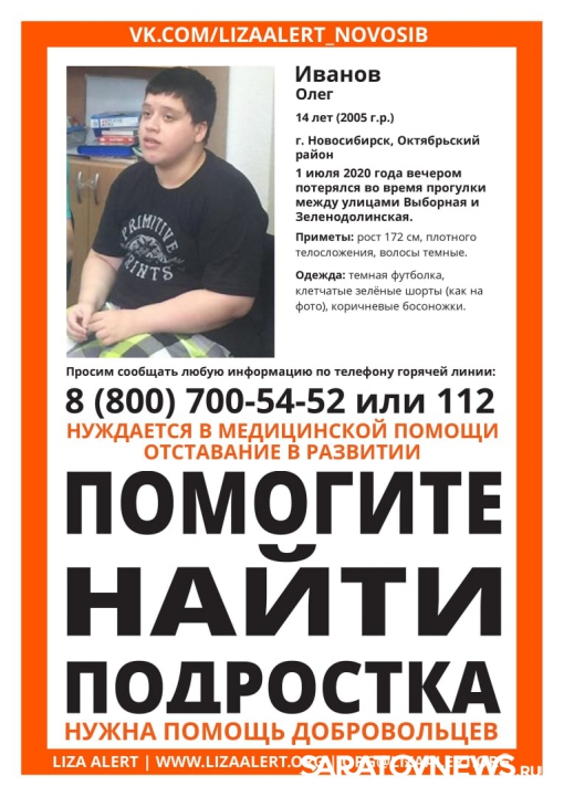 Как сообщили волонтеры поискового отряда «Лиза Алерт» в совей группе в социальной сети, пропал 14-летний Олег Иванов. Мальчик проживает в Нобосибирске, в Октябрьском районе. Вечером 1 июля этого года он потерялся во время прогулки между улицами Выборная и Зеленодолинская.
