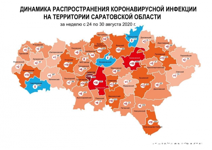 Прирост от 20 до 50 пациентов за неделю имеет Вольский район, а Петровский, Базарно-Карабулакский, Александрово-Гайский, Краснокутский, Пугачевский, Советский, Саратовский и Аткарский подтверждают от 10 до 19 зараженных.