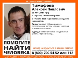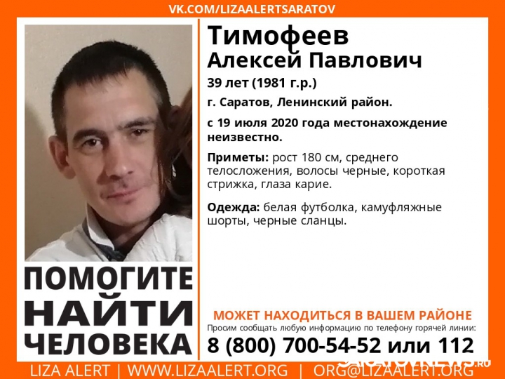 Пропал 39-летний Алексей Тимофеев. Он ушел из дома 19 июля 2020 года и не вернулся. С тех пор его местонахождение не известно. Рост Алексей составляет 180 сантиметров, он среднего телосложения, имеет карие глаза и черные короткие волосы. В день исчезновения на нем была белая футболка, камуфляжные шорты и черные сланцы.