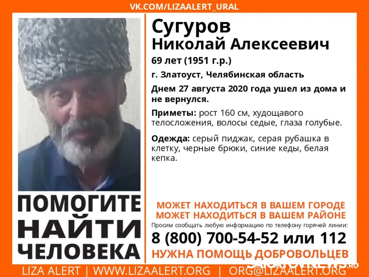 Пропал 69-летний Николай Сугуров. Он проживает в городе Златоуст, в Челябинской области. Днем 27 августа 2020 года пенсионер ушел из дома и не вернулся. Его рост составляет 160 сантиметров. Пропавший худощавого телосложения, у него седые волосы и голубые глаза. В день исчезновения на нем был серый пиджак, серая рубашка в клетку, черные брюки, синие кеды и белая кепка.