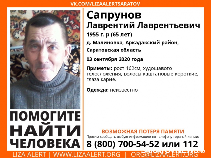 Пропал 65-летний Лаврентий Сапрунов. Он проживает в селе Малиновка, Аркадакского района. 3 сентября 2020 года он ушел из дома и не вернулся. С тех пор его местонахождение не известно.