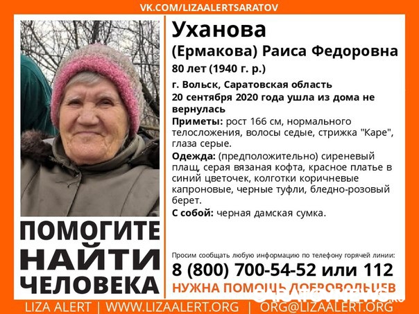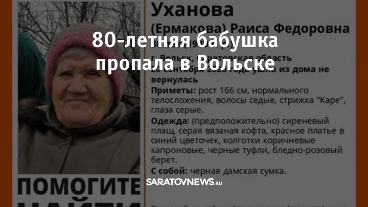 Волонтеры саратовского отделения поискового отряда «Лиза Алерт» сообщают о пропаже 80-летней жительницы Вольска Саратовской области.