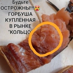 «Будьте осторожны! Горбуша, купленная на рынке «Кольцо»», ― пост с таким текстом сопровождала фотография куска подкопченной рыбы, на которой видны некие прозрачные образования, похожие на паразитов. Речь, очевидно, идет о рынке по адресу: 2-я Садовая, 106А.