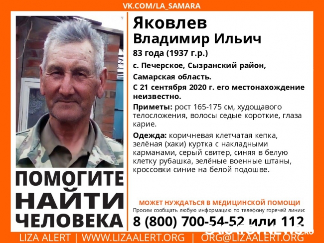 Пропал 93-летний Владимир Яковлев. Он проживает в селе Печерское Сызранского района Самарской области. 21 сентября он ушел из дома и не вернулся, с тех пор его местонахождение неизвестно. Он может, по информации волонтеров, нуждаться в медицинской помощи.