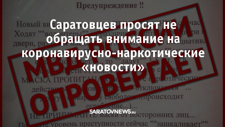 По данным ведомства, через мессенджеры распространяется информация о том, что по квартирам ходят «волонтеры» и раздают маски, пропитанные наркотиком. Якобы при их примерке человек сразу падает без чувств, а его квартиру в это время грабят. Несмотря на явную сомнительность информации, многие жители оказались обеспокоены.