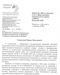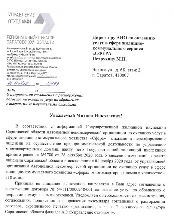 Региональный оператор Саратовской области направил в адрес Автономной некоммерческой организации по оказанию услуг в сфере жилищно-коммунального сервиса «Сфера» (бывшее АТСЖ Ленинского района) уведомление о расторжении договора с 1 ноября 2020 года и переводе обслуживаемых домов на прямые расчеты. Государственной жилищной инспекцией 28 октября 2020 года было принято решение об исключении сведений из реестра лицензий обо всех 318 многоквартирных домах, находящихся в управлении организации.