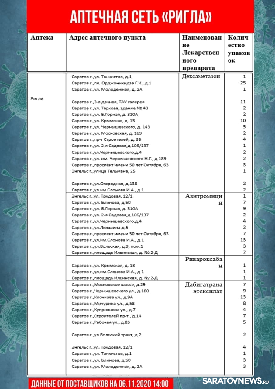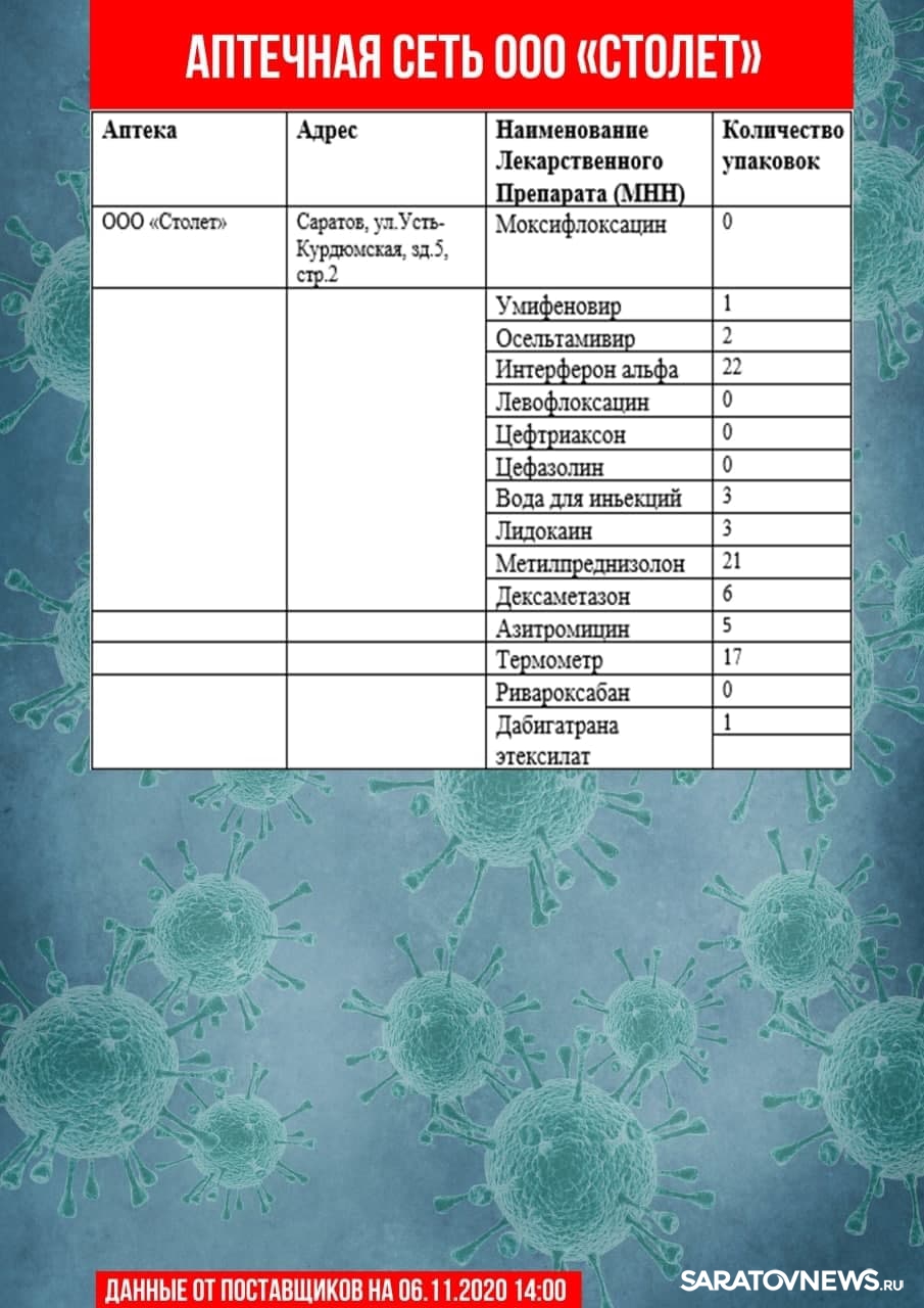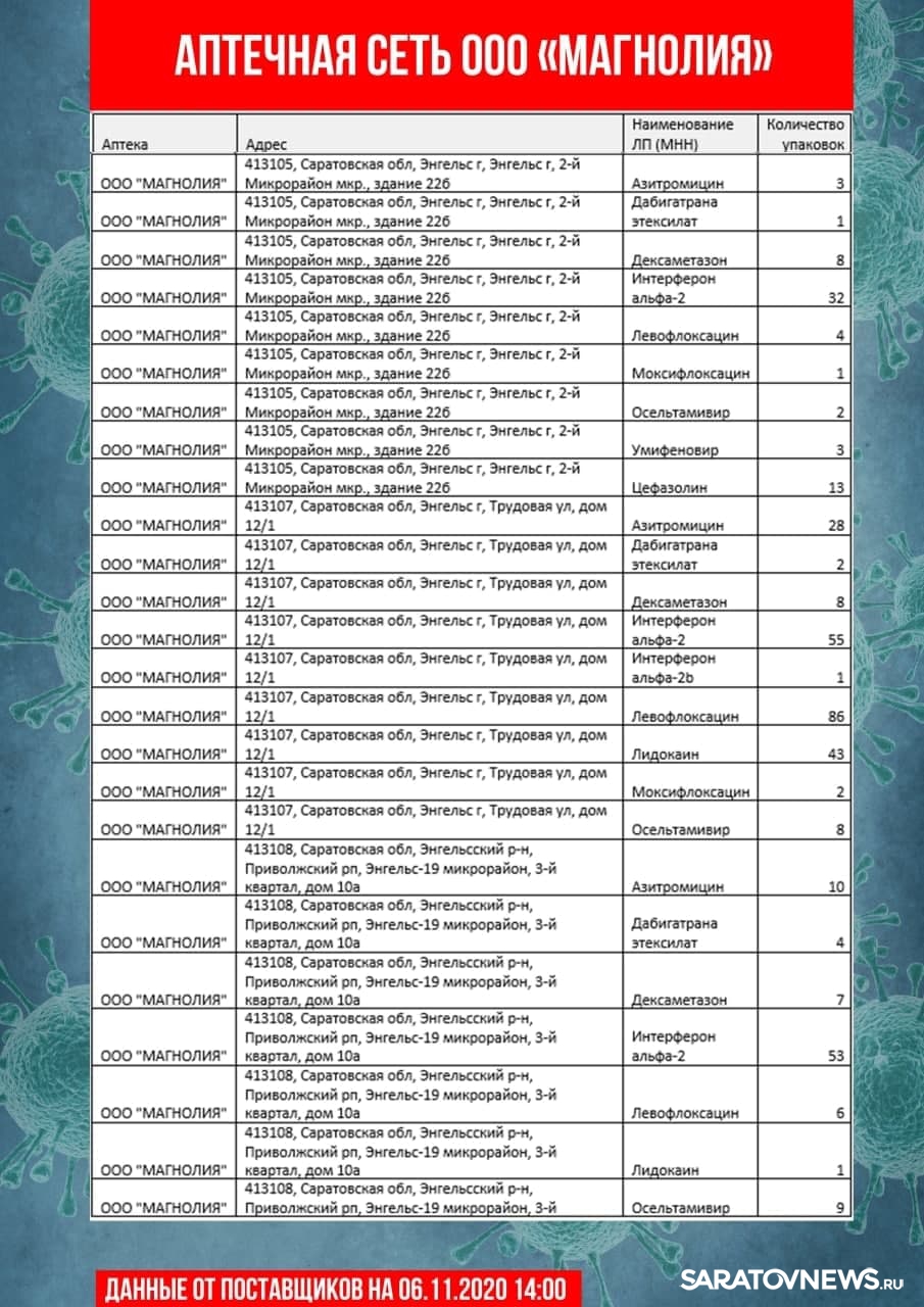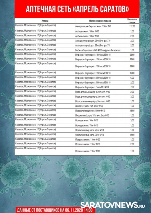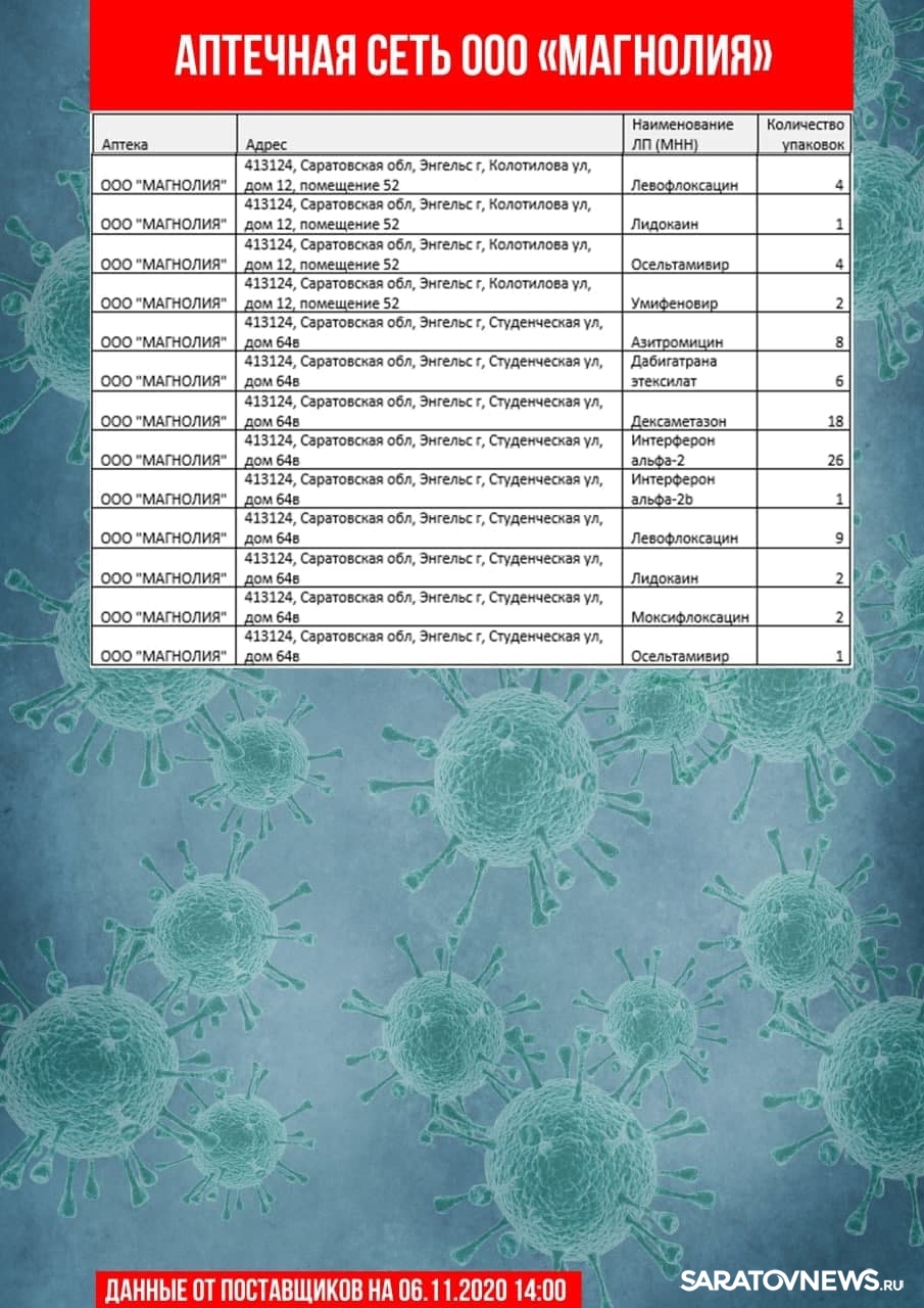 Сегодня, 6 ноября, минздрав Саратовской области предоставил последние данные по наличию лекарств первой необходимости в аптеках Саратова и Энгельса.