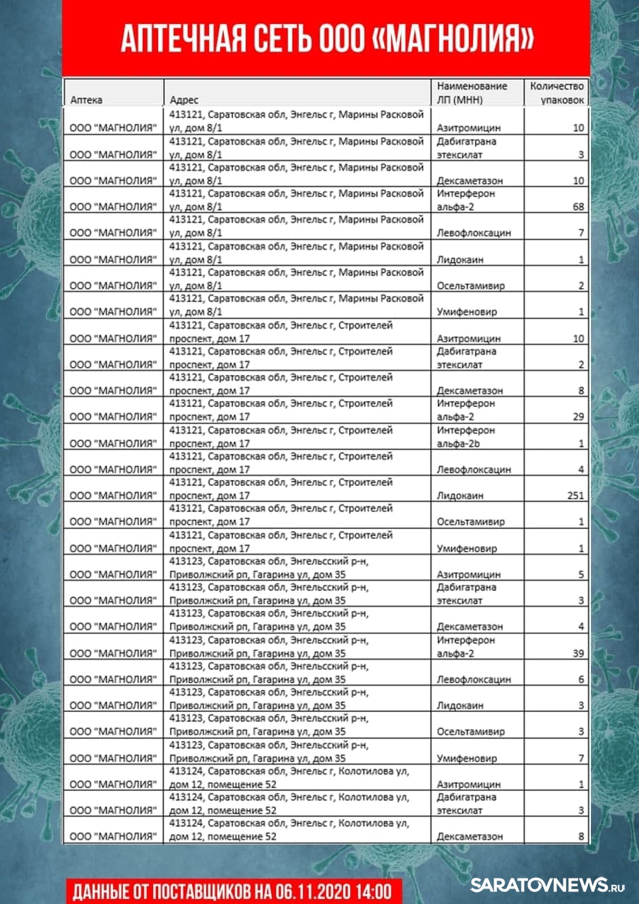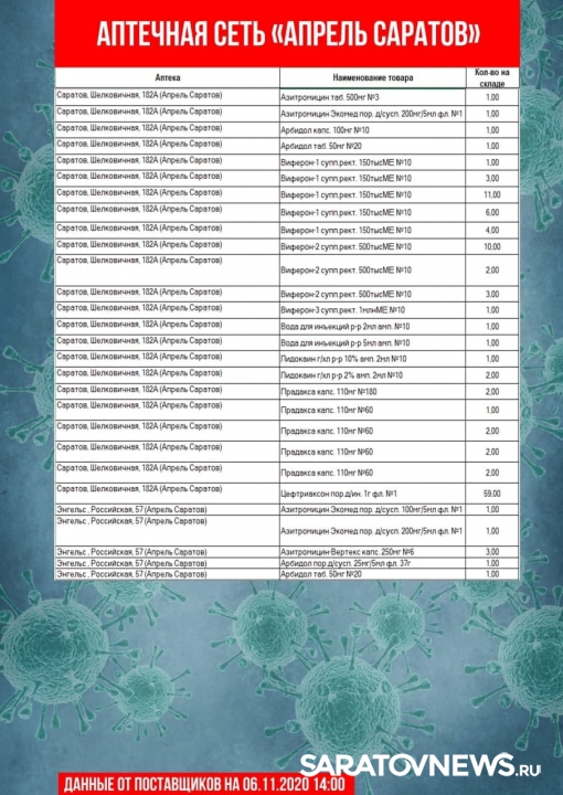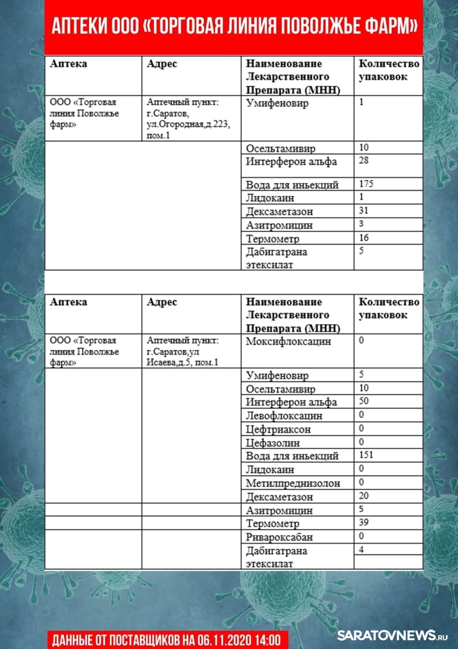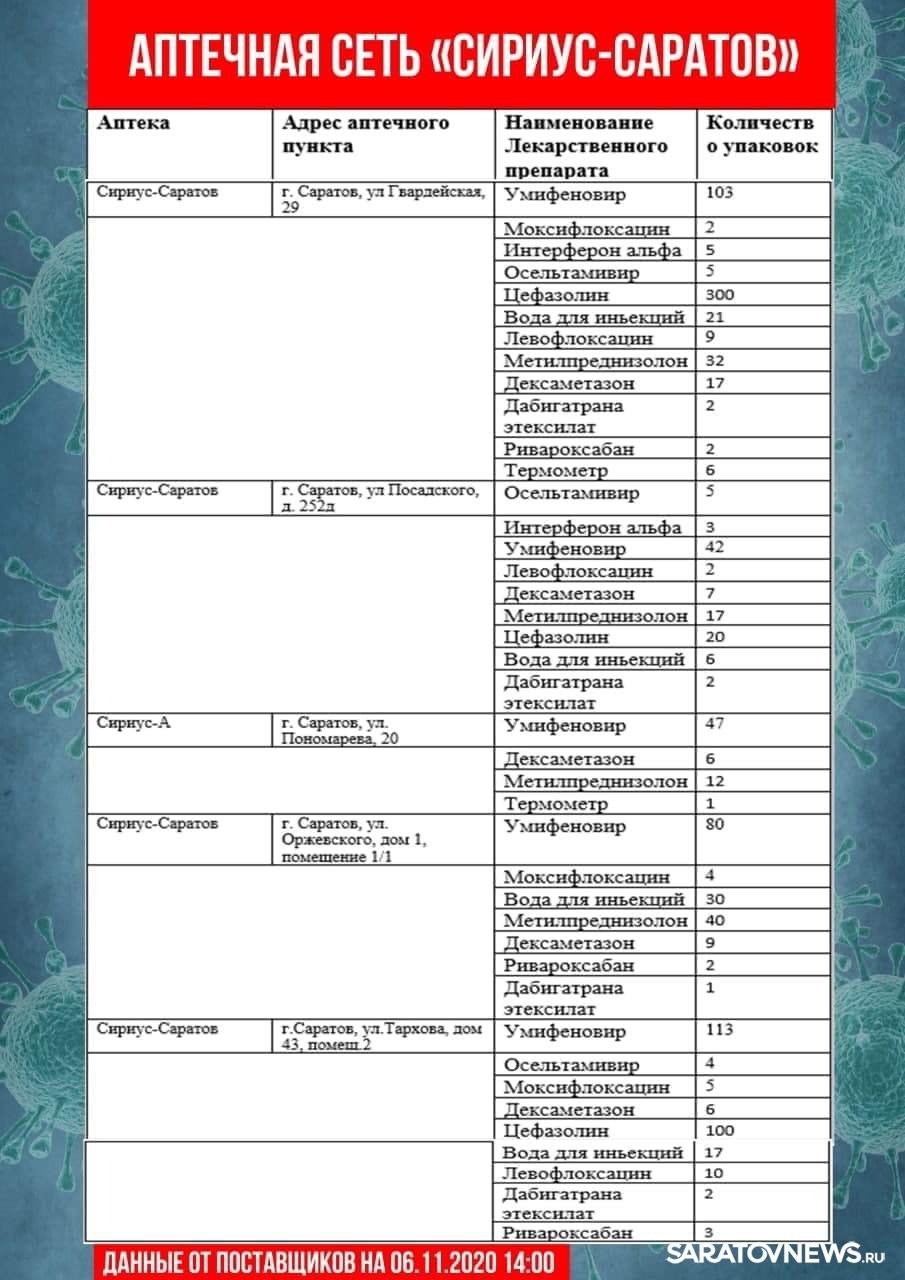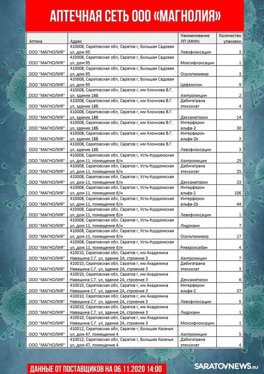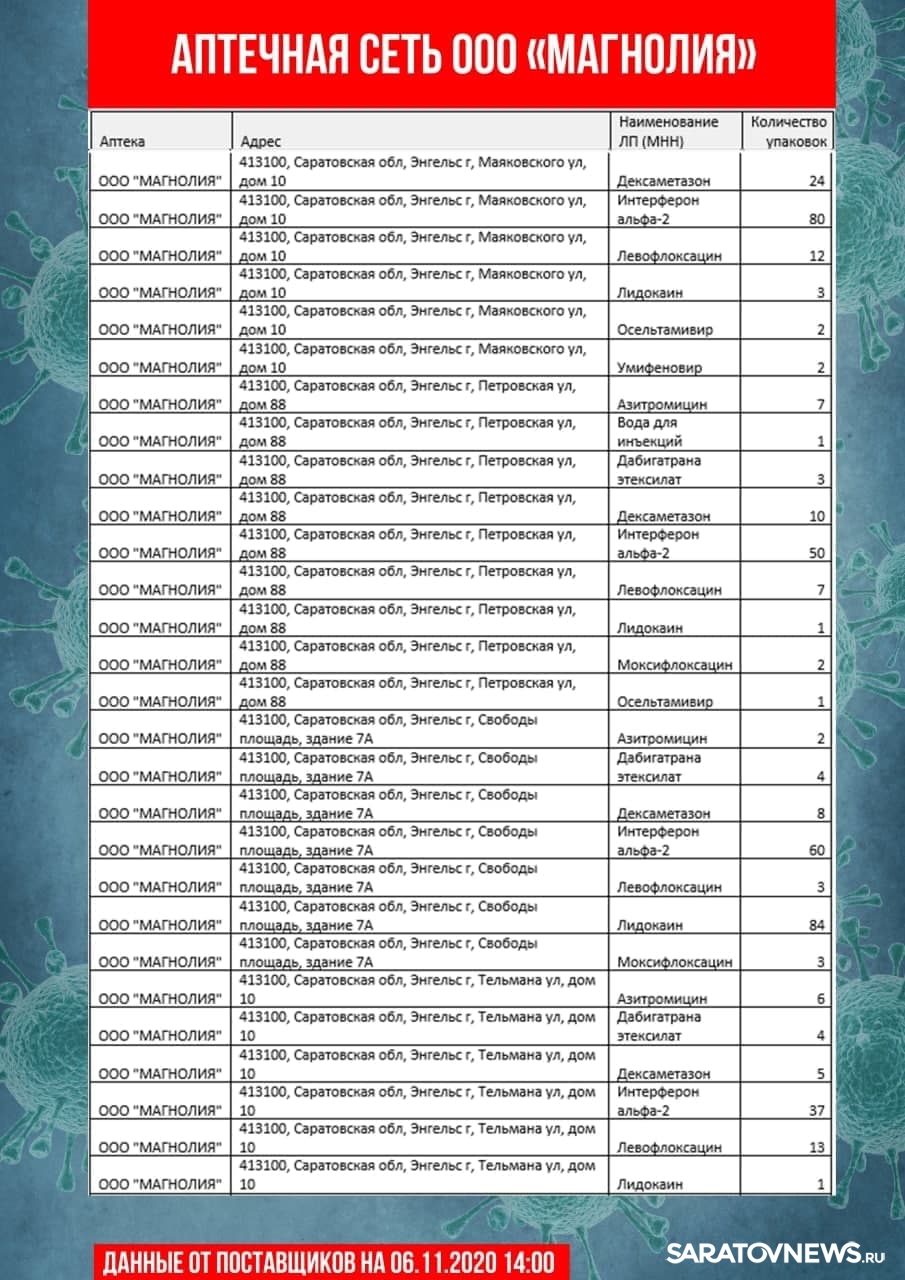 Сегодня, 6 ноября, минздрав Саратовской области предоставил последние данные по наличию лекарств первой необходимости в аптеках Саратова и Энгельса.