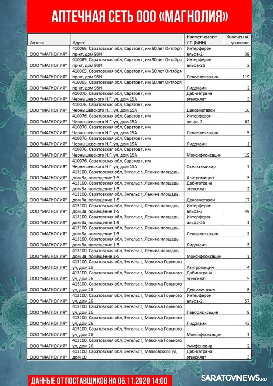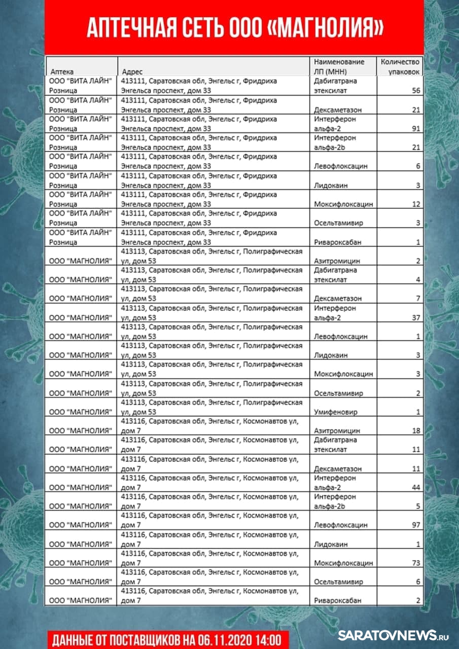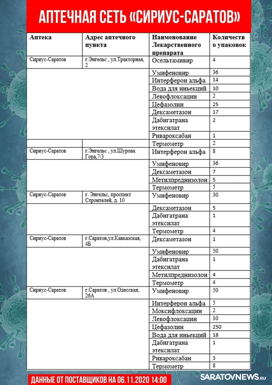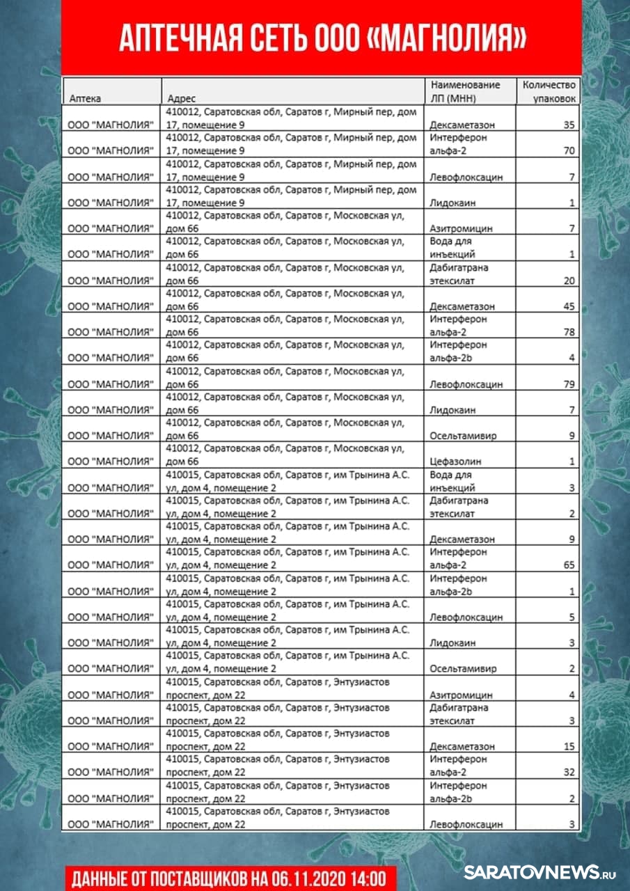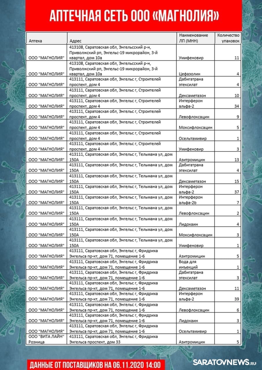 Сегодня, 6 ноября, минздрав Саратовской области предоставил последние данные по наличию лекарств первой необходимости в аптеках Саратова и Энгельса.