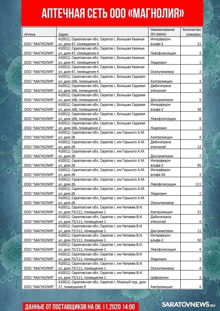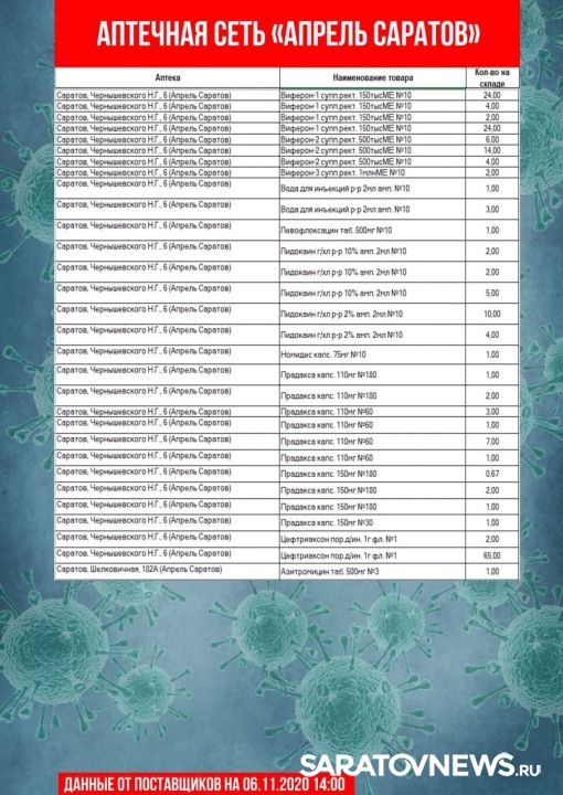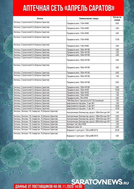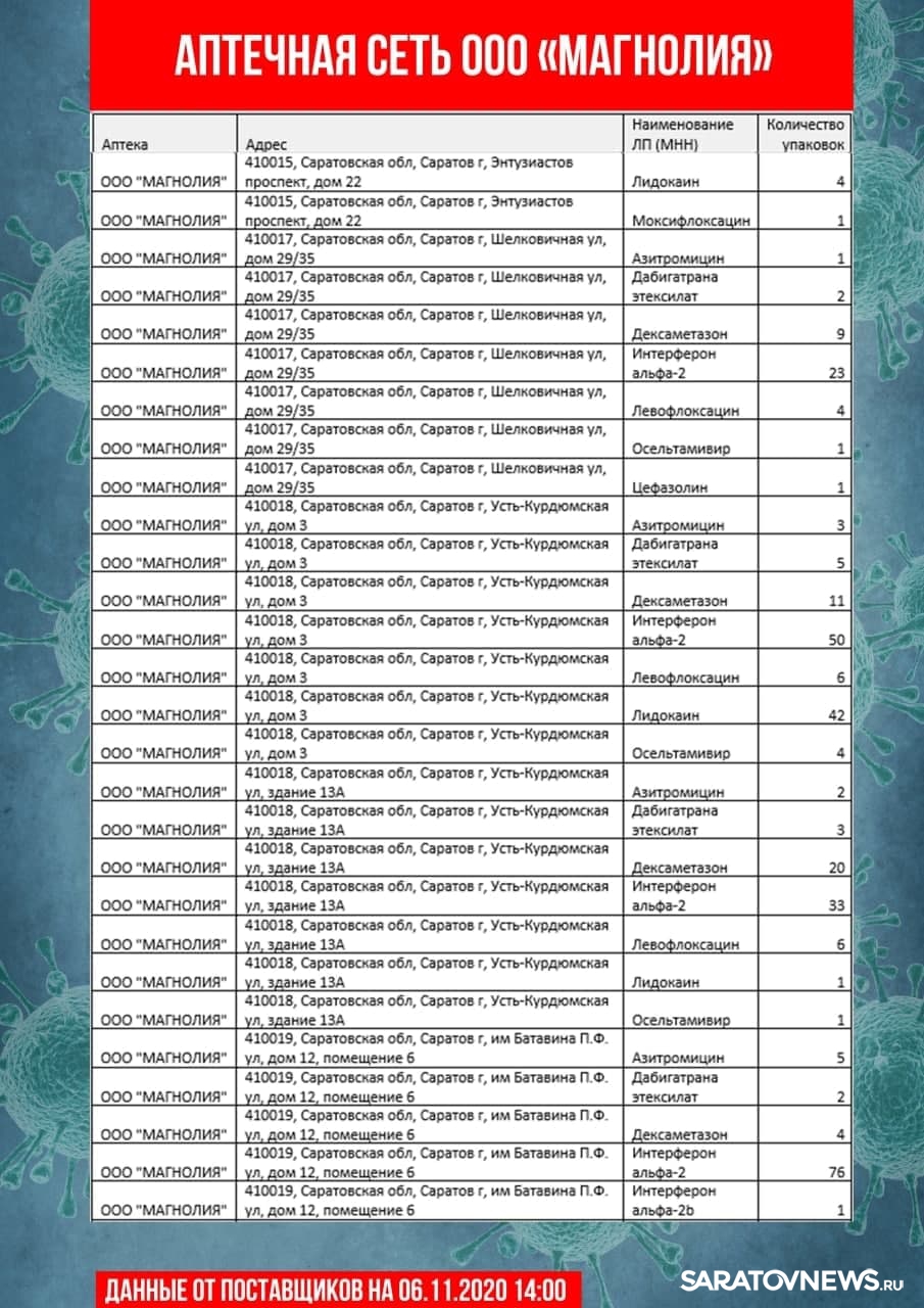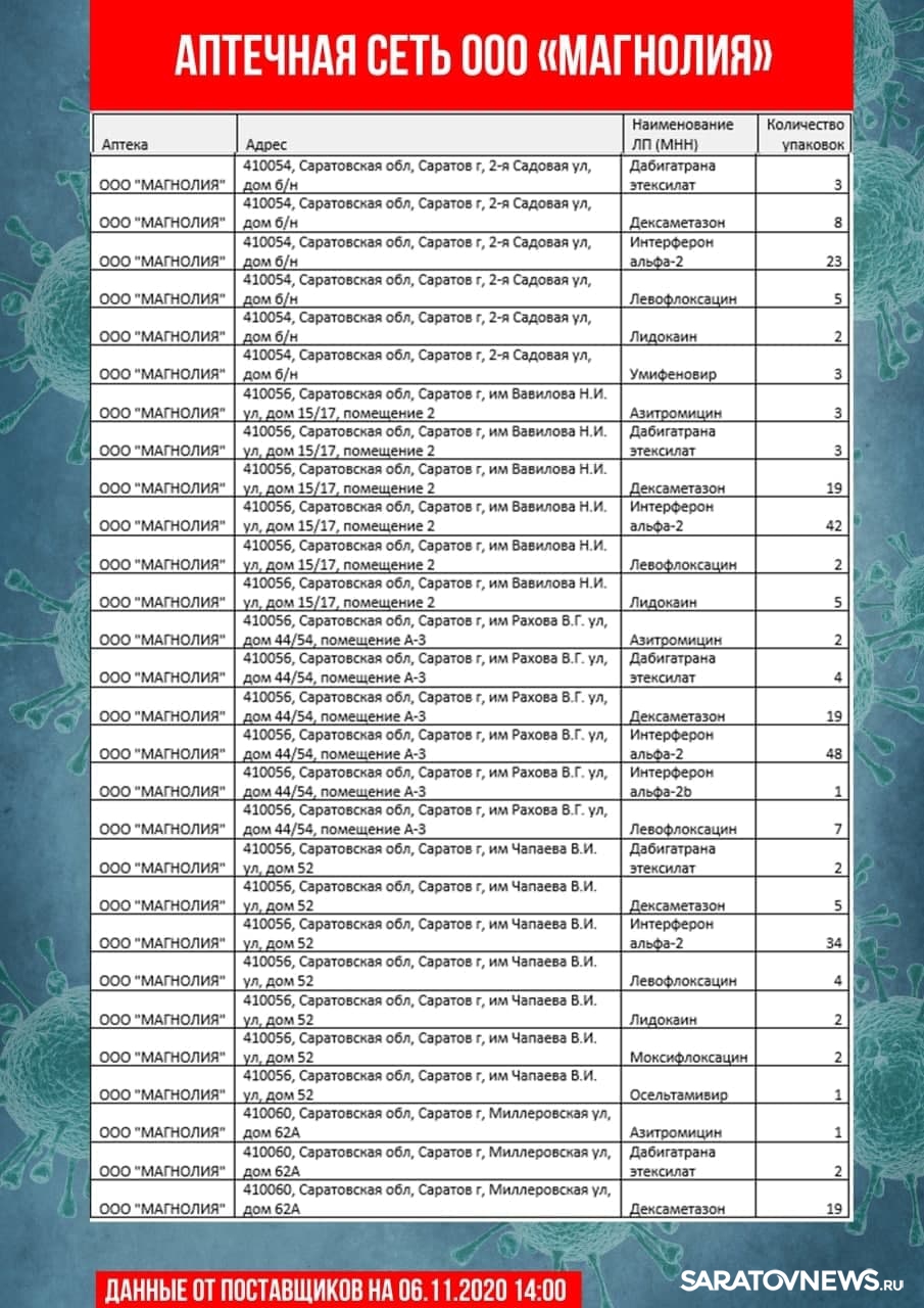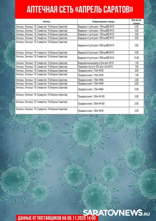 Сегодня, 6 ноября, минздрав Саратовской области предоставил последние данные по наличию лекарств первой необходимости в аптеках Саратова и Энгельса.