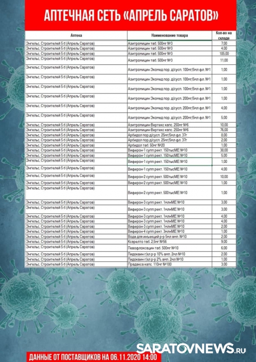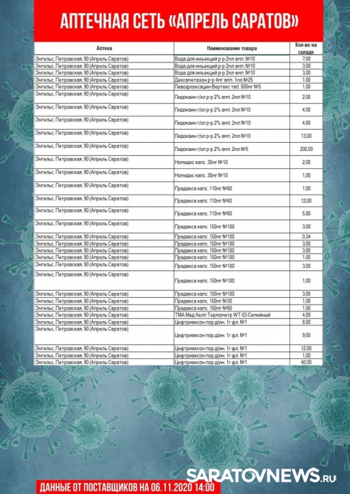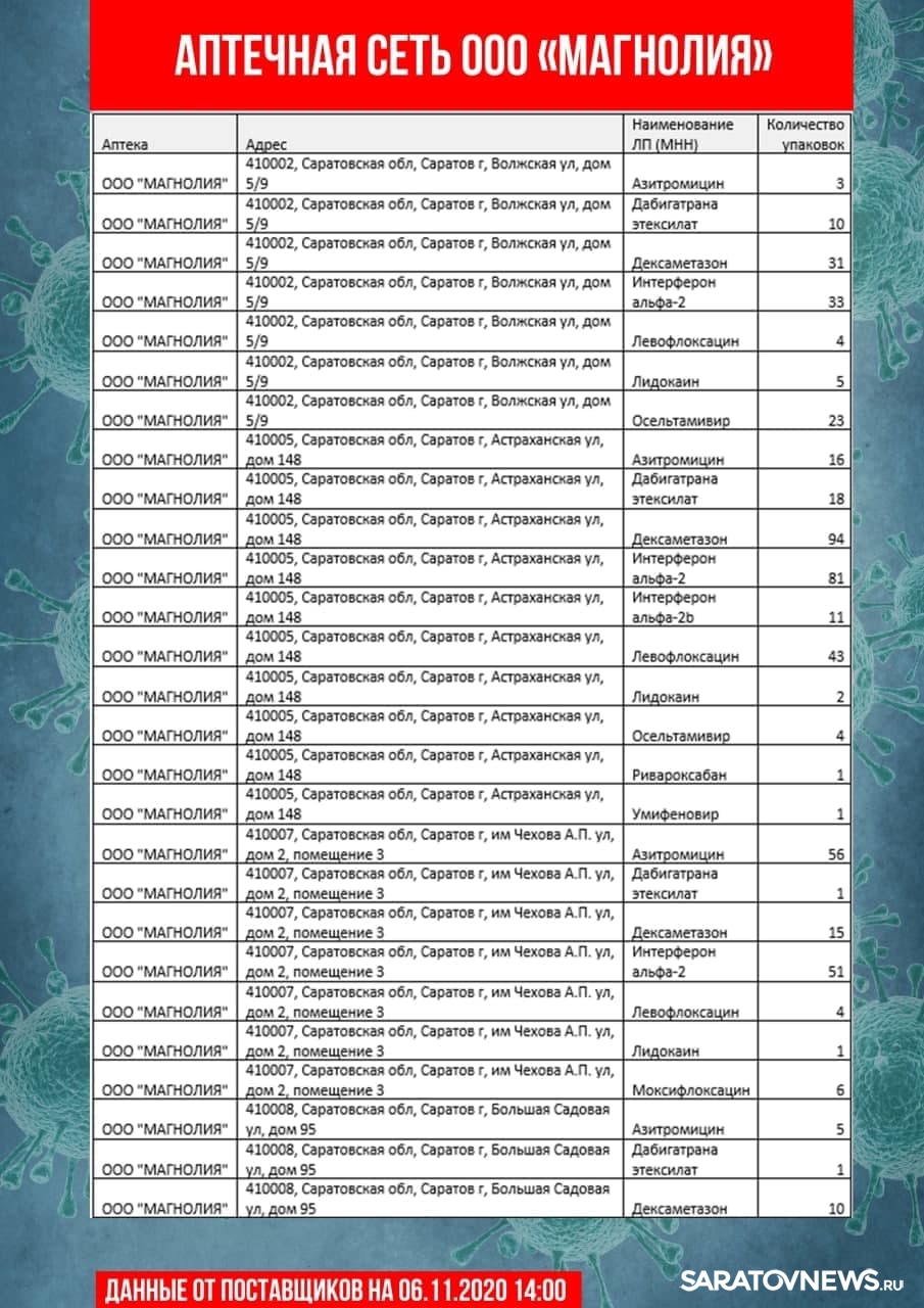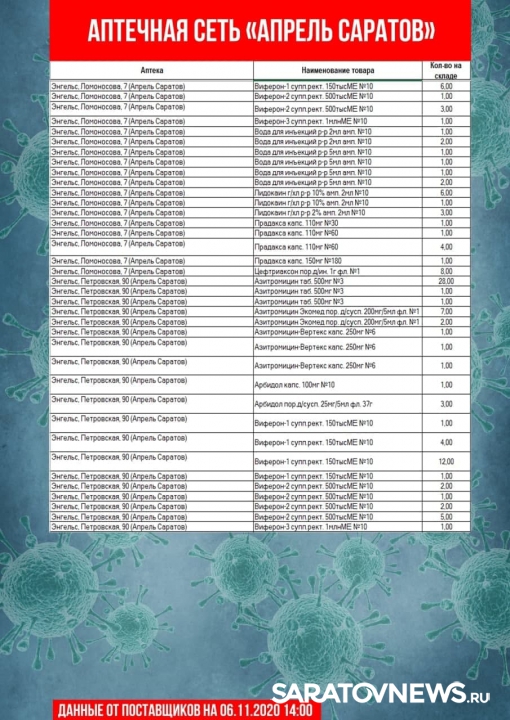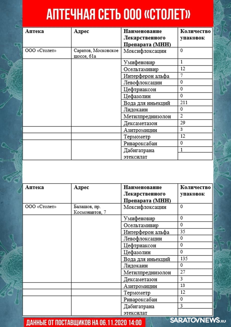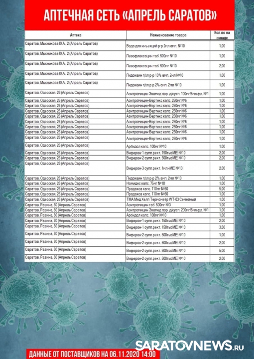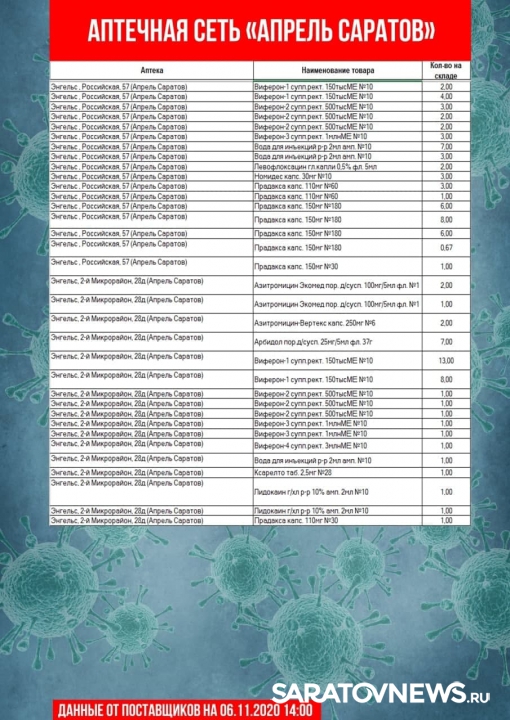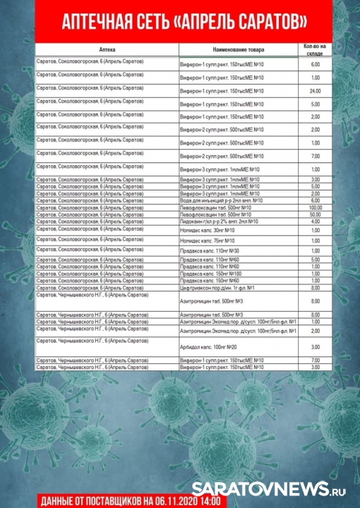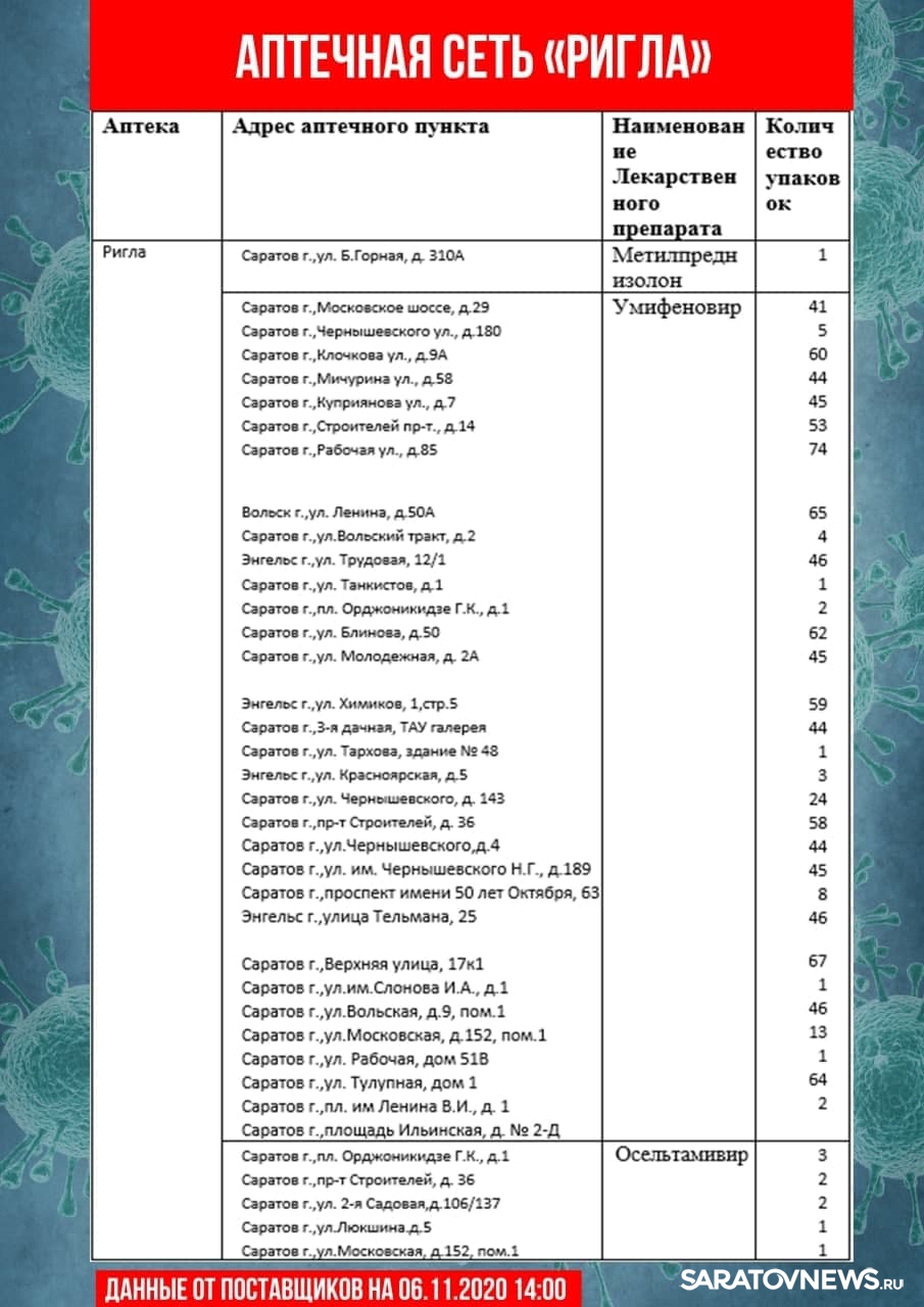 Сегодня, 6 ноября, минздрав Саратовской области предоставил последние данные по наличию лекарств первой необходимости в аптеках Саратова и Энгельса.