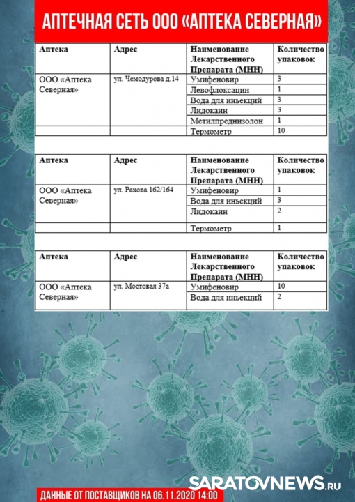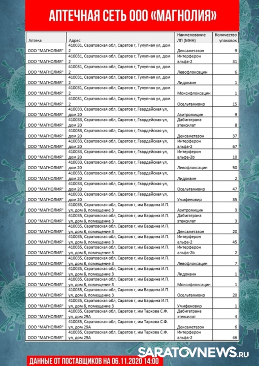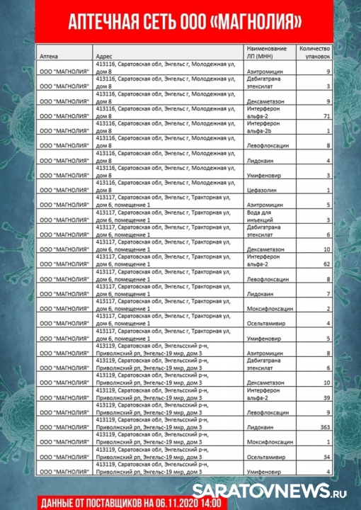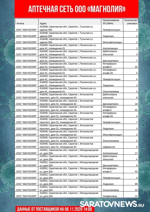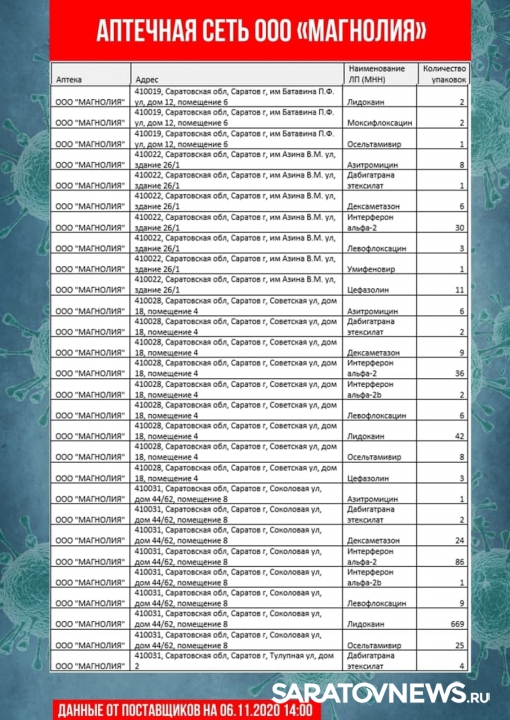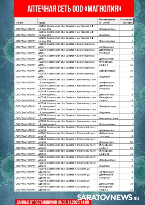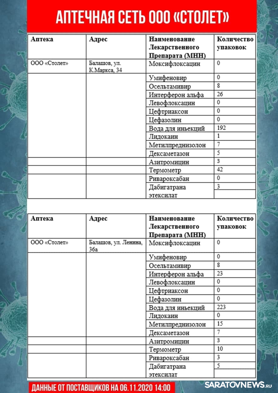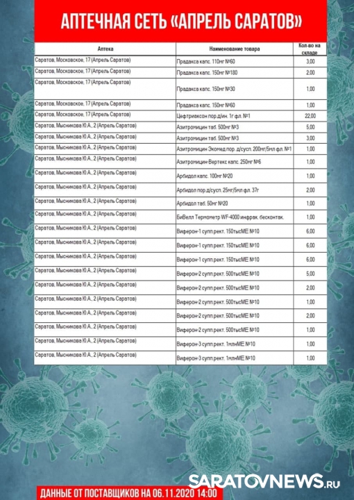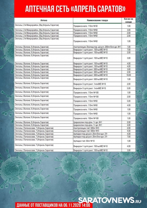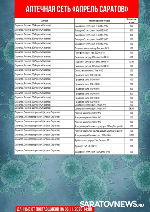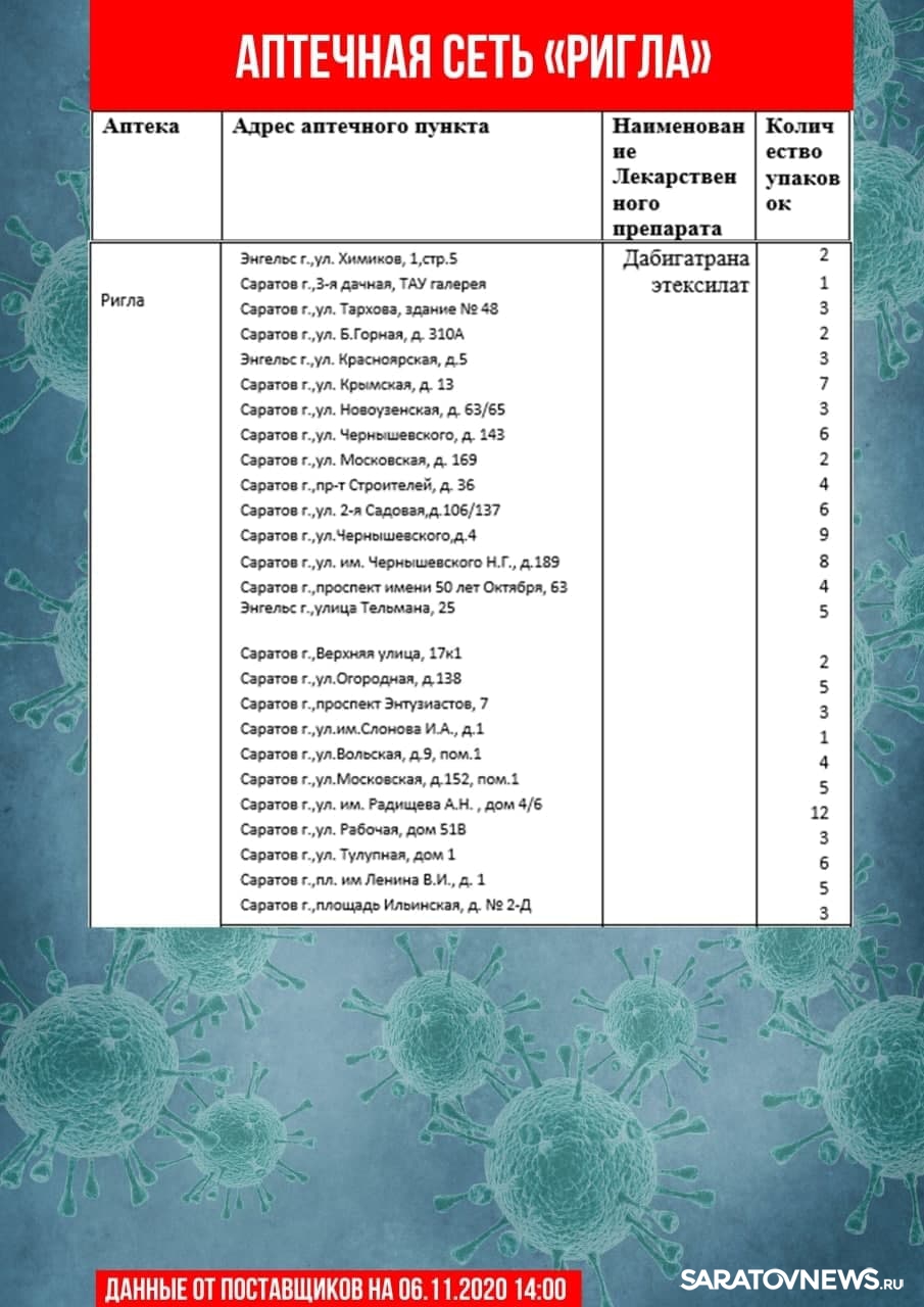 Сегодня, 6 ноября, минздрав Саратовской области предоставил последние данные по наличию лекарств первой необходимости в аптеках Саратова и Энгельса.