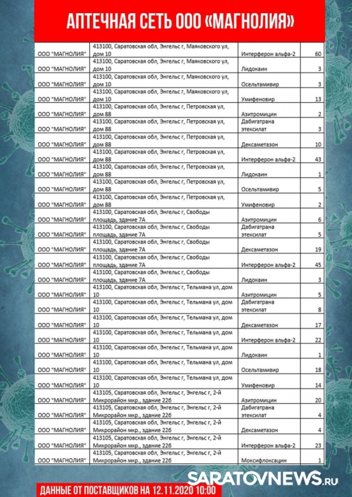 Региональный минздрав рассказал о наличии в аптеках Саратова и Энгельса на сегодняшний день, 12 ноября.