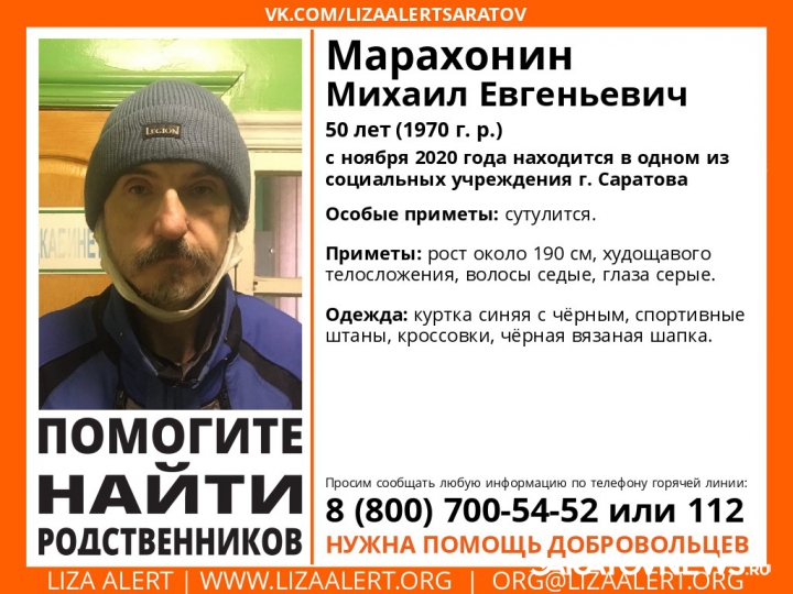 Волонтеры саратовского отделения поискового отряда «Лиза Алерт» разместили в своем сообществе призыв помочь найти родственников 50-летнего Марахорина Михаила Евгеньевича.