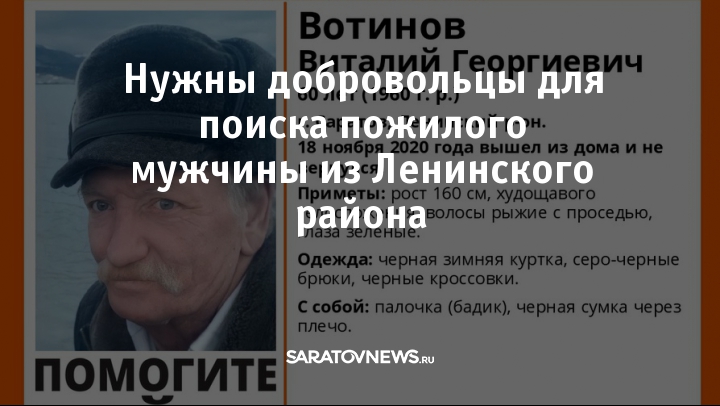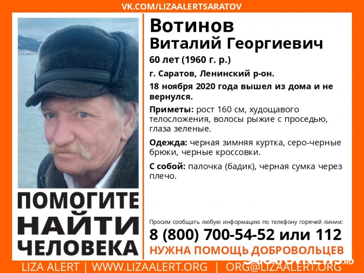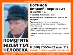 Пропал 60-летний Виталий Вотинов, проживающий в Ленинском районе Саратова. 18 ноября 2020 года он ушел из дома и не вернулся. Рост пропавшего составляет 160 сантиметров, он худощавого телосложения, имеет рыжие с проседью волосы и зеленые глаза.