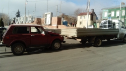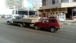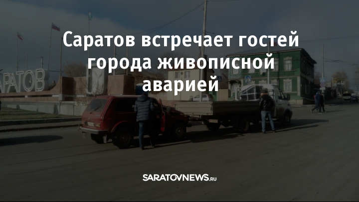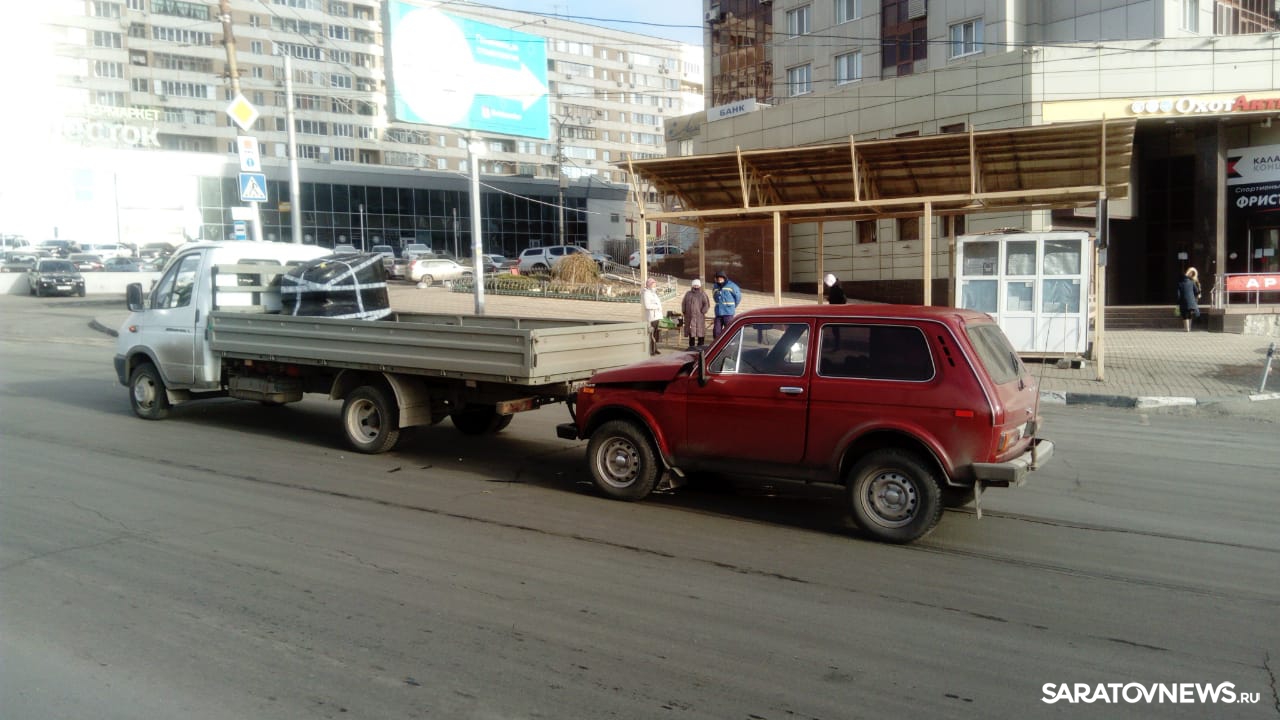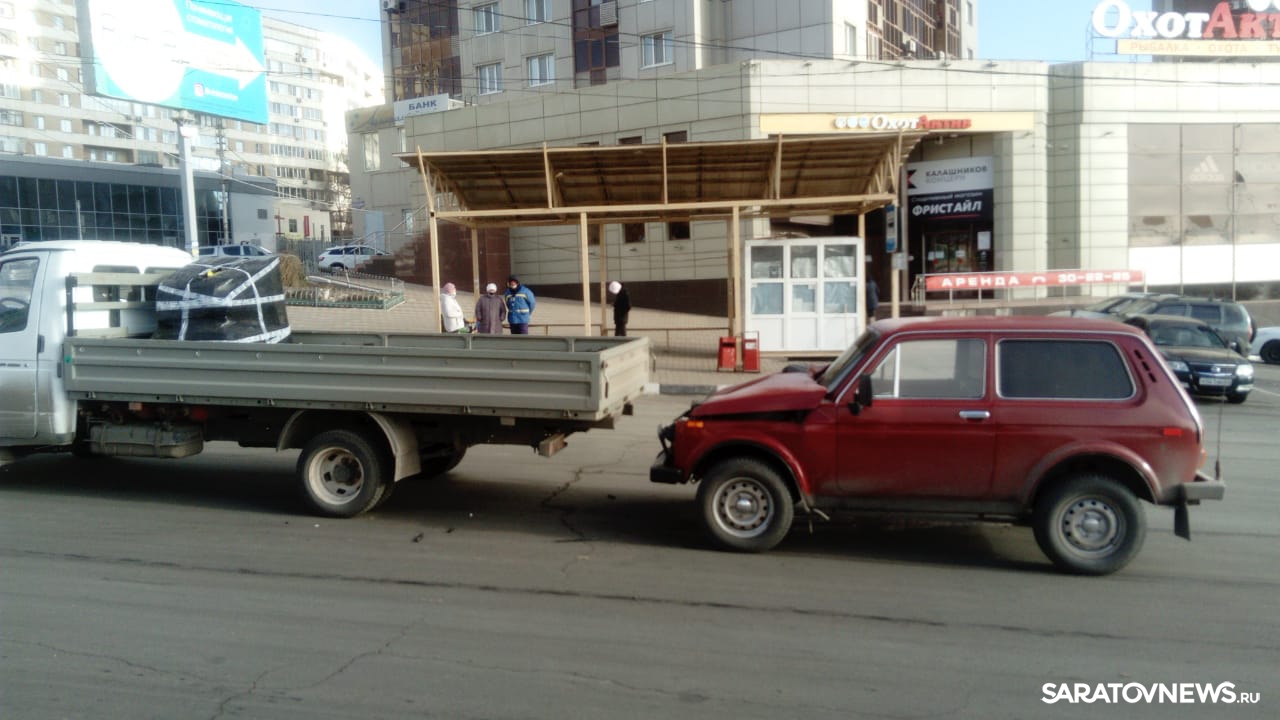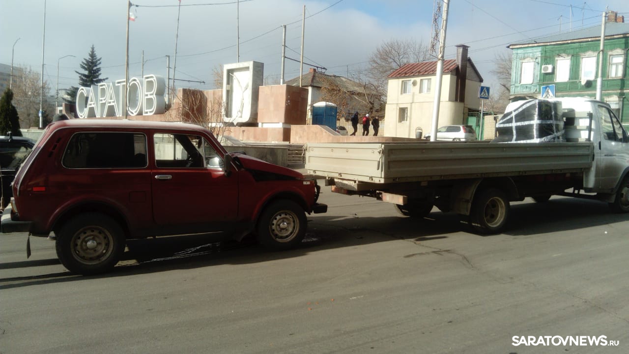 Красная «Нива» случайно догнала «ГАЗель» с прицепом на пустой дороге. Произошло это около 13:15 прямо у стелы «Саратов», расположенной на въезде в город. Водители, судя по всему, не пострадали и вышли, чтобы осмотреть ущерб.