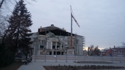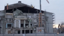 Снос передней части здания почти завершен. Как можно видеть на фото, декоративные колонны на фасаде решили не сохранять. Их ломают вместе с остальными элементами. При этом, колонны несущие, что расположены по бокам, уничтожать не будут. Их, по словам подрядчика, "бережно снимут" и уберут, а потом вернут обратно.