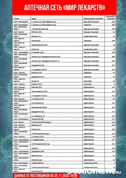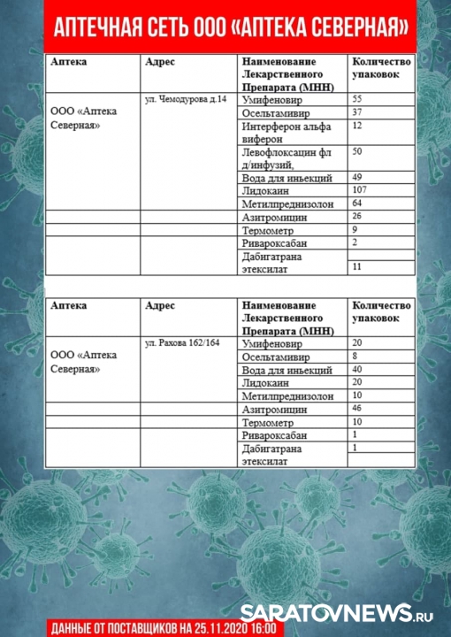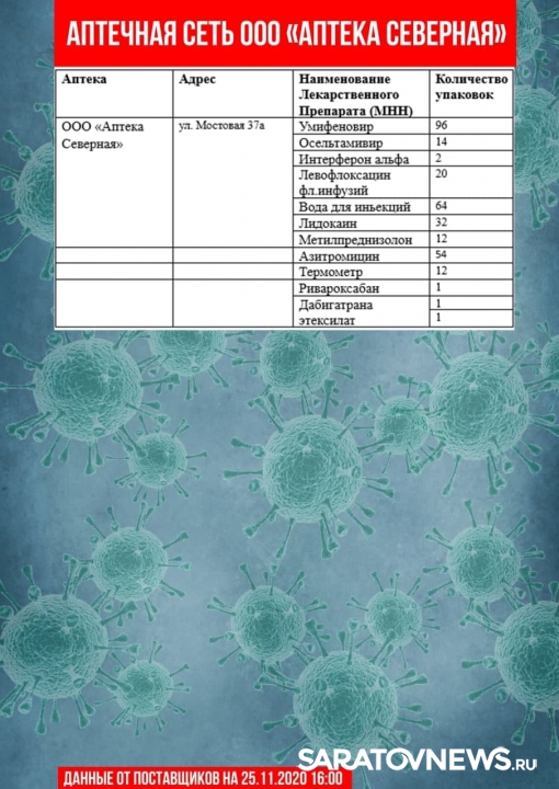 Данные актуальны на 16:00. Перед горожанами пока отчитались представители двух аптечных сетей: «Аптека северная» и «Мир лекарств». В списках присутствуют пока только саратовские адреса, энгельсских нет. Зато есть большой перечень товаров: вода для инъекций, осельтамивир, ривароксабан и другие медицинские товары.