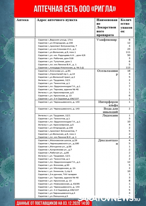 Сегодня, 3 декабря, был опубликован обновленный список лекарств, которые есть в наличии в аптеках Саратова и Энгельса. Данные предоставлены региональным минздравом.
