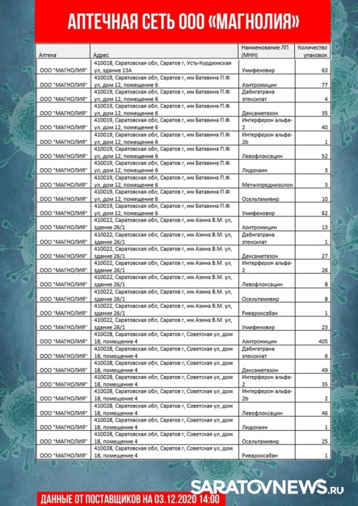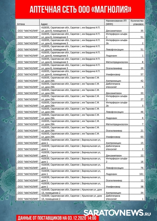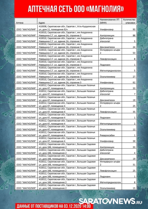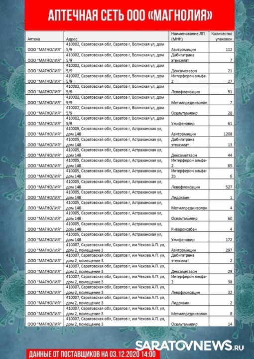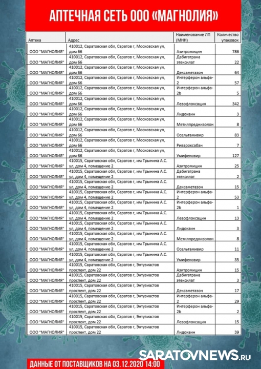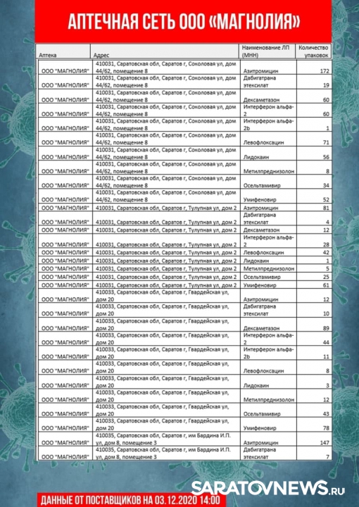 Информацию о своей продукции предоставили аптечные сети «Магнолия», «Ригла», «Аптека Северная». В списке десятки адресов в Саратове и Энгельсе. Данные актуальны на 14:00. Горожане смогут узнать, где купит, лидокаин, азитромицин, воду для инъекций, термометры и другие медицинские товары.