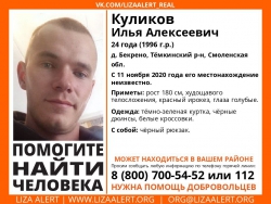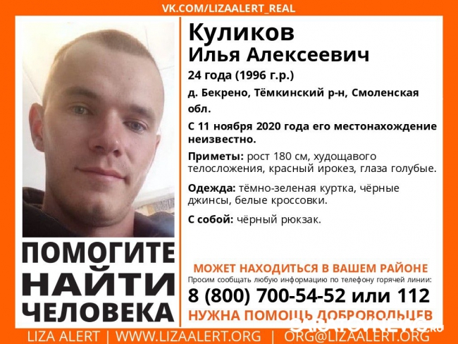 Пропал 24-летний Илья Куликов. Он проживает в деревне Бекрино, Темкинского района, Смоленской области. 11 ноября 2020 года его видели в последний раз, с тех пор местонахождение молодого человека неизвестно.