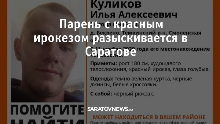 Рост пропавшего составляет 180 сантиметров, он худощавого телосложения. Имеет прическу ирокез красного цвета. В день исчезновения на нем была темно-зеленая куртка, черные джинсы и белые кроссовки. С собой он имел черный рюкзак.