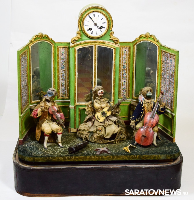 В Саратовский областной музей краеведения чудесным образом попала редкая вещь – музыкальные часы с фигурками трех обезьян. Это автоматон – марионетка с механическим приводом, выполняющая действия по заданной программе. Игрушка изначально была неисправна.